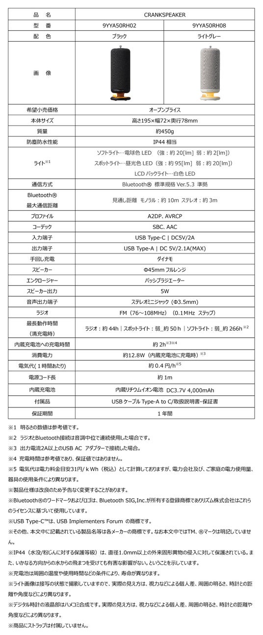 リズム株式会社(取締役社長 湯本武夫)は、もしもの時も給電できるBluetooth(R)接続の手回し充電ワイヤレススピーカー「CRANKSPEAKER」を2025年8月中旬より発売いたします。