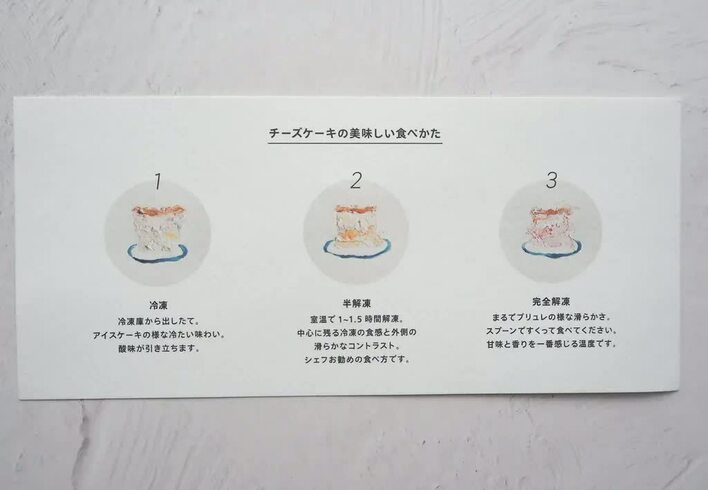 さらに嬉しいのは、味わいの変化を3パターン楽しめること。冷凍のままだと、酸味が引き立つアイスケーキのような食感に。半解凍(室温で1〜1.5時間解凍)だと、中は冷凍・外は滑らかといった味のグラデーションを堪能。そして完全解凍だと、ブリュレのような滑らかさで甘みと香りを楽し無ことができた。今日はどんな風に食べようか…と、迷う時間すら愛おしい。ちなみに、シェフのおすすめは半解凍だそうだ。