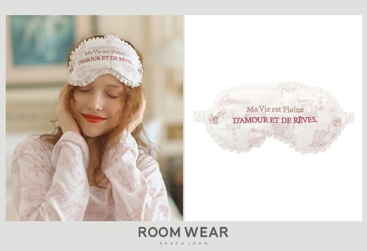 フリルのトリミングに刺しゅう、ローズモチーフなど凝ったディテールを盛り込んだ贅沢な仕上がりのアイマスクは、本体は2枚の生地の間に中綿入りでふわふわしたやさしい着用感。周囲はぐるりと、シフォンのフリルをトリミングしてロマンティック。表側は総柄プリント生地に、オフホワイト地にモーヴ系で、パリの街並みをプリント。刺しゅうは「Ma Vie est Plaine D’AMOUR ET DE REVES.(私の人生は愛と夢に満ちている)」の刺しゅう入り。左右の端には、立体的なローズモチーフのアクセント。後ろ側のひもは平ゴムをサテン生地でくるんだ仕様で頭にフィット。くしゅくしゅとギャザーが寄って可愛らしさをプラス。同柄のルームウェアや雑貨を展開し、コーディネートが楽しめます。