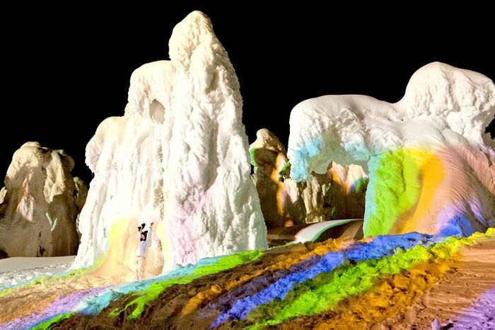 さらに、夕方5時からはライトアップも実施。色彩豊かな照明で浮き上がる樹氷は、昼とは異なる幻想的な姿を見せてくれます。