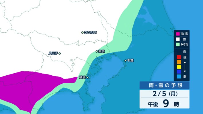 東京都内では、週明け月曜日の夕方頃から八王子周辺で雪が降り始め、火曜日の午前2時ごろまでは東京都のほぼ全域で雪やみぞれが降る予報となっています。