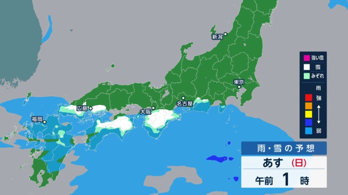 これからの予報では白いマークの雪のエリアは日曜日に近畿地方や中国地方で広がり