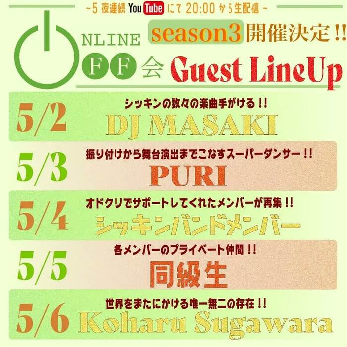 4月に入ってからの本格的な自粛期間にスタートした、YouTubeライブ配信でシッキンのオフな会話をそのまま生配信するトークイベント「s**t kingzのオンラインオフ会」が、ゴールデンウィークにシーズン3として再開決定。