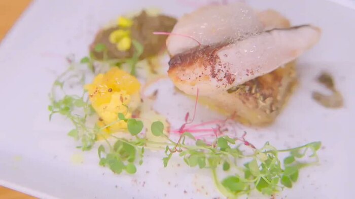 櫻井:なんだこりゃ。カレーと一括りにしてはいけないような。「フレンチ?」「ここはどこ?」みたいな、美しい一皿ですね。さわらの火入れも、普通のレストランで出てくるものより美味しい。完璧な火入れだし、味も完璧だし。じゃがいものミルフィーユも、食感がほっくり、柔らかくて、甘みも立たせていて。感服いたしました。素晴らしい。