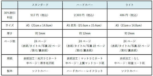 楽しかったあの瞬間の思い出を、一冊の物語として楽しめるフォトブックが何回でも・何冊でも30%割引に。高画質なスタンダード、特別な思い出にぴったりなハードカバー、気軽に作れるお手頃価格のライトの3種類の中から、目的に合わせてお選びいただけます。