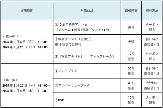 「10周年特典アルバム」1冊無料プレゼント、追加の写真プリント半額などの「大感謝セール」を実施