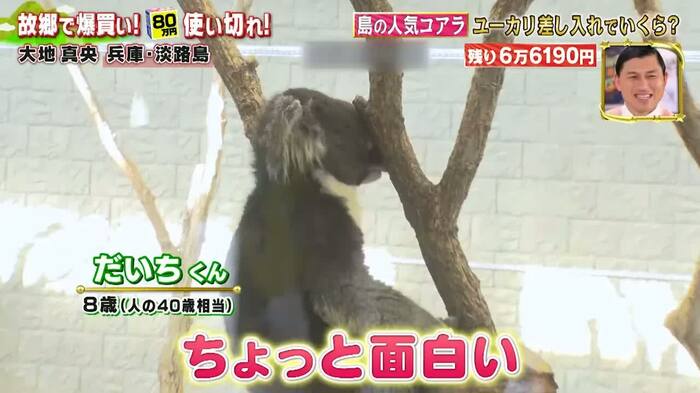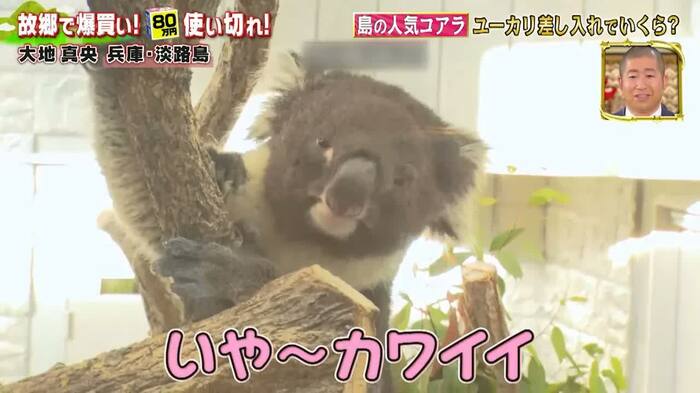 ほかにも大地さんは島内のさまざまなスポットを訪問。高級鮮魚店「花光」でアワビを、遠戚が営む「守本よね商店」では段ボールいっぱいのわかめを購入し、予約二ヵ月待ちの寿司店「のぶ」で高級寿司に舌鼓。大地さんの夫がデザインを手がけた中華そば店「いのうえ」ではお客さんたちにラーメンを奢り、観光スポット「イングランドの丘」ではコアラの「だいち」とふれあいました。