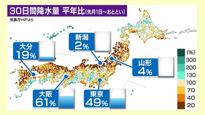 気象庁によると、7月1日から7月30日までの30日間の降水量の合計は平年に比べて大幅に少なく、東京都心でも平年の49%。九州や本州の日本海側はさらに低く、大分では19%、特に深刻な新潟では、わずか2%となっています。