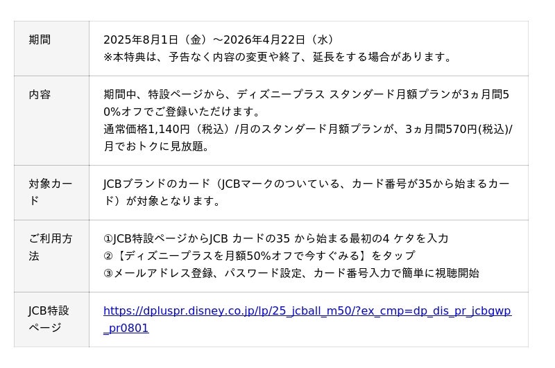 株式会社ジェーシービー(本社:東京都港区、代表取締役会長兼執行役員社長:二重 孝好、以下:JCB)は、2025年8月1日(金)からディズニー公式動画配信サービス「ディズニープラス」のスタンダード月額プランが3ヵ月間50%オフとなるキャンペーンを実施します。