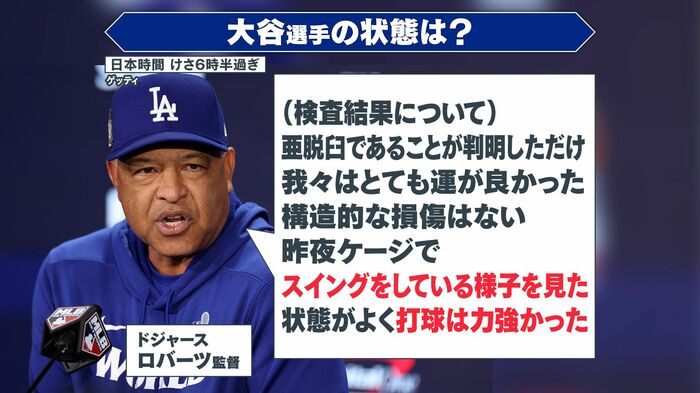 ロサンゼルス・ドジャースのロバーツ監督は、試合前のインタビューで大谷選手のけがの具合について、「(検査結果について)亜脱臼であることが判明しただけ、我々はとても運が良かった。構造的な損傷はない、昨夜ケージでスイングしている様子を見た。状態がよく打球は力強かった」とコメントしました。