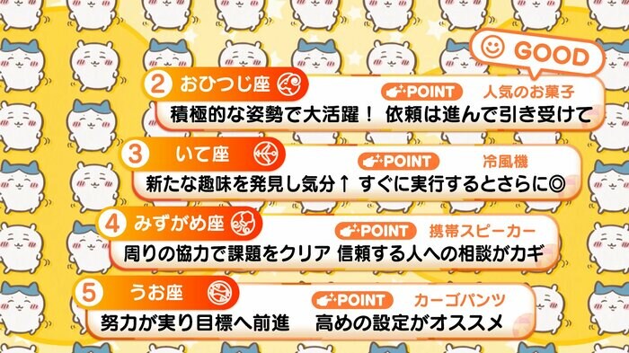 『めざましテレビ』で放送中の「ちいかわ占い」 テレビ放送がない日はお休みで、月~土:朝7時以降に更新予定です。
