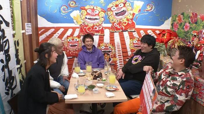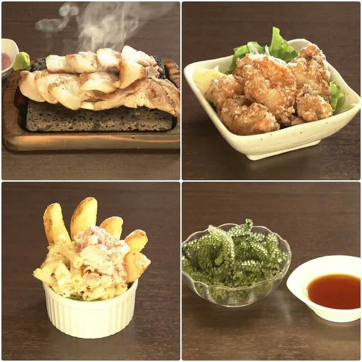 岡崎体育が来店したのは、中目黒にある沖縄料理店「やんばるミートセンター」。沖縄の名産あぐー豚のロース肉約500グラムを豪快に焼き上げたあぐー豚の骨付きロース肉(2480円)は、脂の甘みを引き立てるハイビスカス入りの塩をつけていただくお店の看板メニュー。沖縄で採れる島タコの唐揚げ(580円)は、噛めば噛むほど味わい深い、お酒にぴったりの一品。ほか、海ぶどう(540円)、ポテマカ(580円)をいただき、さっぱり爽快なシークァーサーサワー(480円)で乾杯。※すべて税込