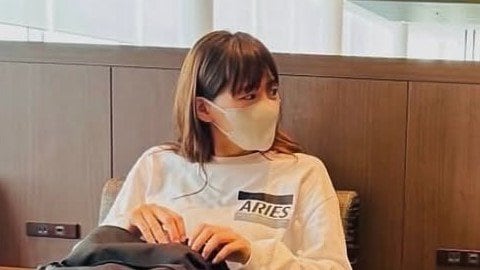 空港の椅子にマスク姿で座っている綾瀬さん。