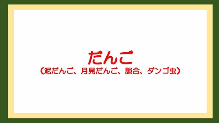 正解は「だんご(泥だんご、月見だんご、談合、ダンゴ虫)」。
