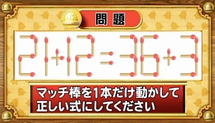 「21+12=36+3」。この式のマッチ棒を1本だけ動かして正しい式にしてください。
