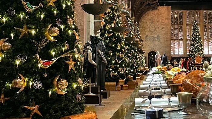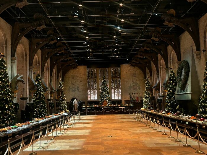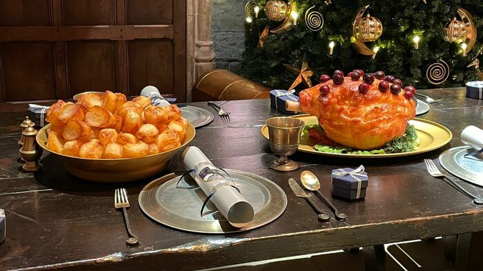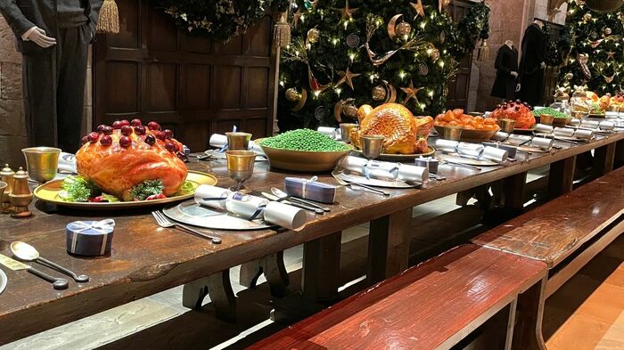 ハリーや親友のロン、ハーマイオニーなど多くの生徒たちが食事や勉強をする大きなダイニングテーブルにずらっと並んだ豪華なクリスマス料理の数々。