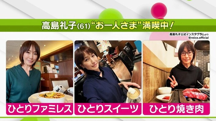 最近、高島さんは“お一人さま”を満喫中だそうで、「ひとりファミレス」「ひとりスイーツ」「ひとり焼肉」に行ったことを楽しそうに報告。