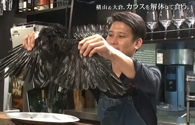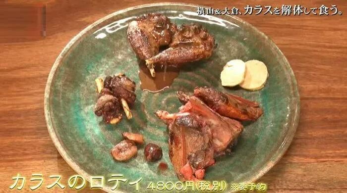 シェフの中原昇龍さんから、フランスではカラスは高級食材で一般的に食べられていると聞き、驚く2人。そして目の前に出されたのは、黒光りするカラスがそのまま一羽!
