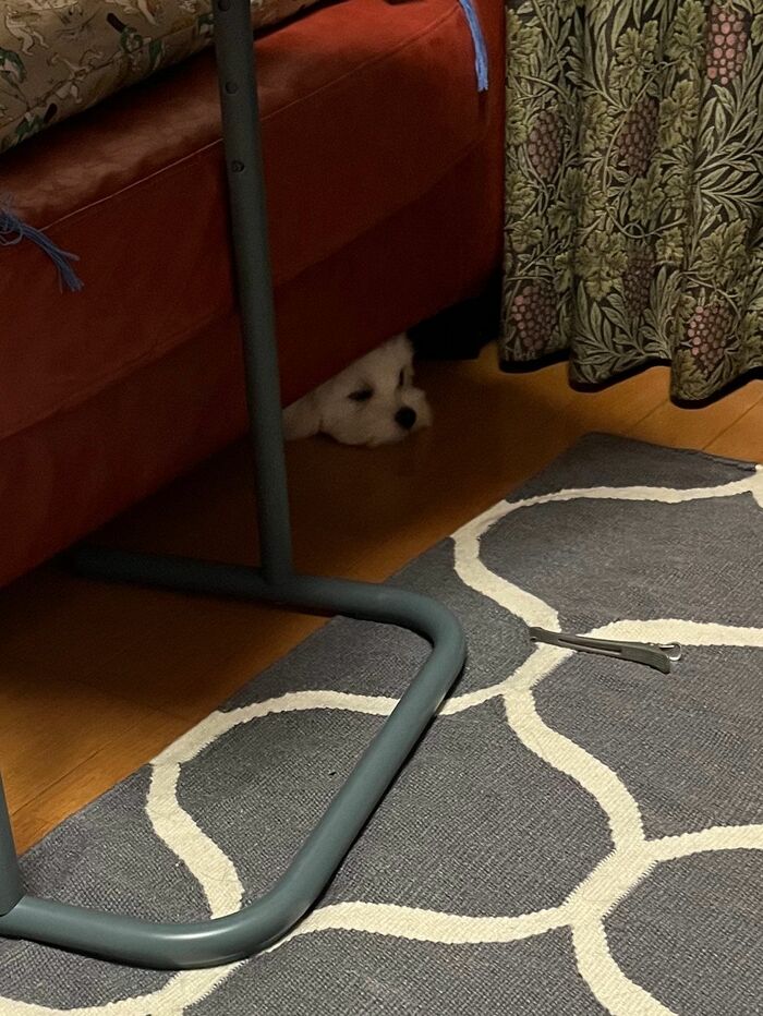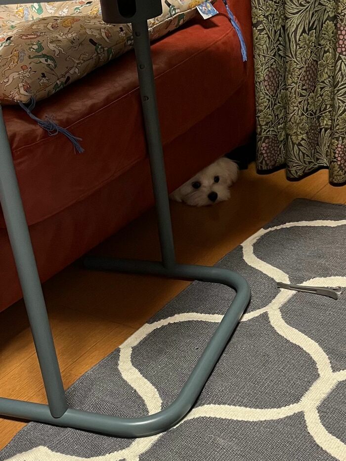 「怒られるとわかりやすく拗ねる」というコメントと共に投稿された写真にはソファの下に隠れるしゃりくんの姿が!暗闇に真っ白なしゃりくんのしょんぼりした顔が浮かび上がっています。