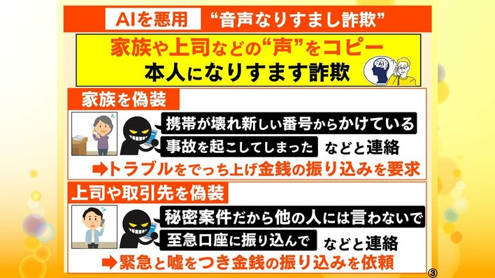 最近では、警察をかたって現金をだまし取る手口や、AI技術を使って知り合いや家族の声を生成し、本人になりすまして詐欺の電話をするという手口など、新たな手口も登場しています。