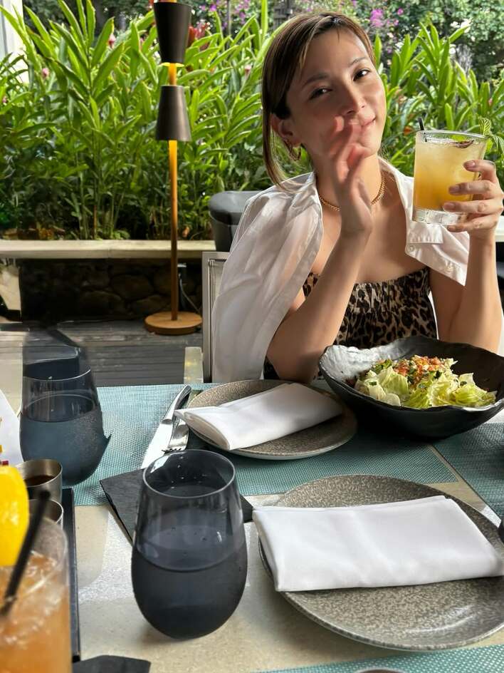 そこには、南国リゾートのような緑豊かなテラス席でドリンクを片手にカメラに向かってほほ笑む加藤さんの姿が。家族が撮影したのでしょうか?とても自然体でリラックスした表情です。