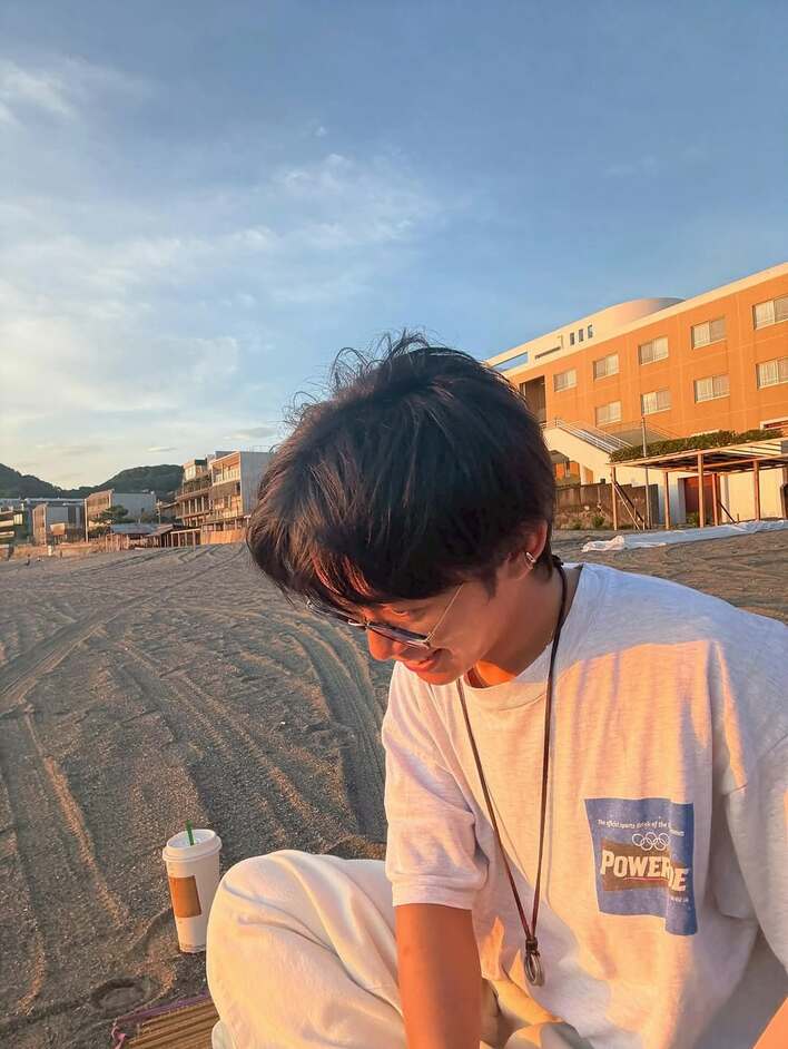 ブルーのカラーサングラスをかけて、砂浜に座った姿を公開。