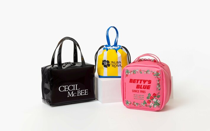 ギャルファッションのカリスマブランド【CECIL McBEE】のコスメポーチは、光沢のあるツヤ感をリアルに再現し、350mLのペットボトルが入るサイズでミニバッグとしても活躍します。リゾートカジュアルブランド【ALBA ROSA】は、かつて大流行した片ナップショルダー型のショッパーをイメージした巾着ポーチに。象徴的なハイビスカスのロゴとカラーリングがインパクトのあるデザインです。カラフルなデザインが目を引く【BETTY‘S BLUE】は、イチゴ柄ショッパーをそのまま再現し、使い勝手にこだわった2層構造のコスメポーチになりました。