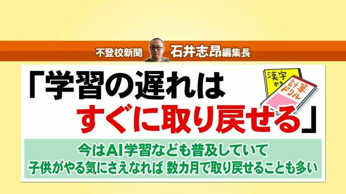 石井さんは「学習の遅れは子供がやる気になれば、数ヶ月で取り戻せる」と語り、実際に不登校の経験がある母親の「半年間学校に行けなかったが、その後大学にも行けたし、仕事もできている。振り返ってみれば、一瞬のこと」という言葉も紹介されました。