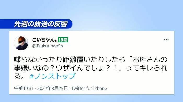 「母がいろんなことを押しつけてくるタイプなので距離を置くことにしたのだが、『お母さんのことが嫌いなの?』などと取り乱すように。その状態が19歳になった今も続いている」という、先週の放送を見た視聴者・こいちゃん。さんのお悩みも登場しました。