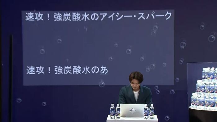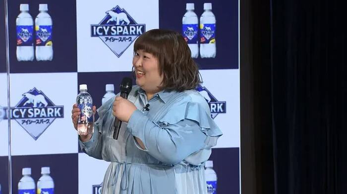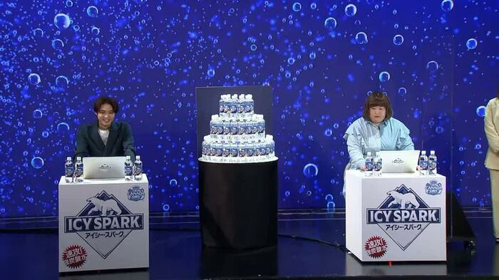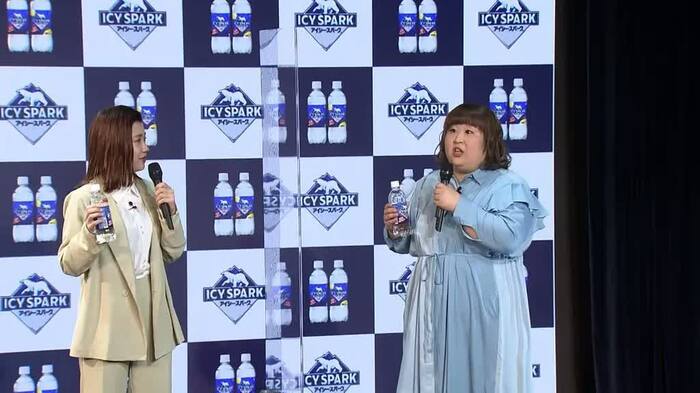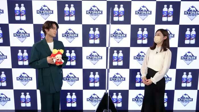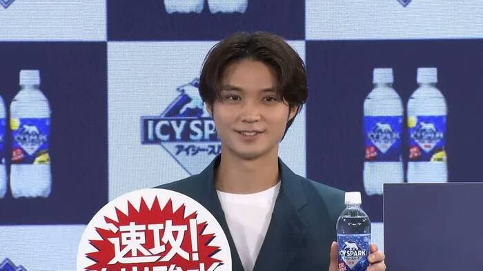 磯村勇斗さんが出演する“速攻!強炭酸水”「アイシー・スパーク」の新CM発表会が3月31日に行われ、磯村さん、特別ゲストの3時のヒロインより福田麻貴さんとかなでさんが登壇しました。