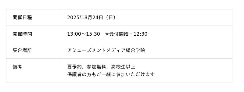さらに、「エンタメ業界に興味はあるけれど、希望の職種や学科が決まらない」という方へ向けた「AMG学校説明会」も開催。業界全体のお話を交えながら、AMGで学べることやエンタメのお仕事の魅力について学院スタッフが詳しく説明させていただきます。