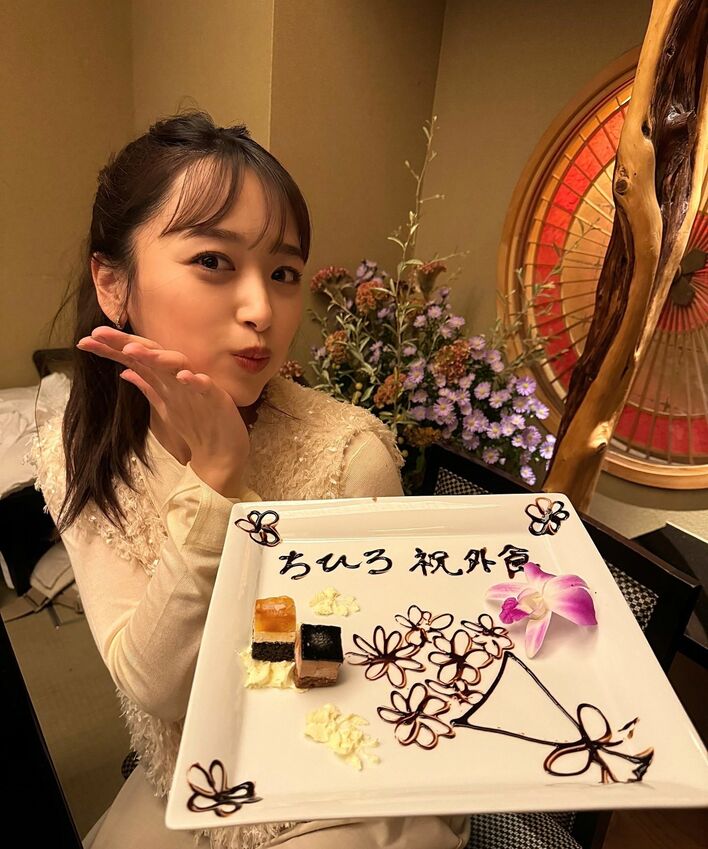 「相方ちゃんがわたしのプレートも用意してくれてて笑ってしまった」とつづり、「ちひろ 祝外食」と書かれたサプライズケーキをもらったそう!