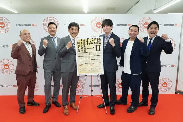 4月3日、大阪・なんばグランド花月(NGK)で開催された、吉本興業創業110周年特別公演「伝説の一日」。2日間に渡って行われたイベントの最終日千穐楽に出演した博多華丸・大吉、千鳥(大悟・ノブ)、ギャロップ(林健・毛利大亮)の3組が、出演後に記者の囲み取材に応じました。