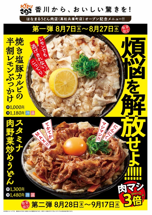 肉店(高松兵庫町店)限定メニューのうち「焼き塩豚カルビの半割レモンぶっかけ」「スタミナ肉野菜炒めうどん」を全国のはなまるうどんでも販売。どちらも通常のはなまるメニューの3倍の肉を使用しています。ボリュームたっぷりで、夏にぴったりな、スタミナの付く肉盛りうどんをお試しください。
