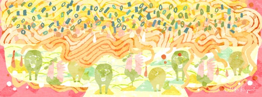 肉店(高松兵庫町店)は、淡いグレーの外装に大きなはなまるマークを配した、スタイリッシュでモダンな佇まいが特徴です。店内には高松出身の人気イラストレーター・オビカカズミさんによる横幅約5mの巨大壁画を設置。鶏、牛、豚がランダムに並び、どんぶりの上にはあふれんばかりに載ったうどんで「煩悩」コンセプトを表現しています。心地よい空間で、こだわりのメニューをお楽しみください。