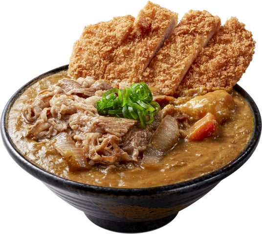 器ギリギリまで攻めた、あふれ盛りの肉カレーうどんが登場。牛肉&とんかつを贅沢に