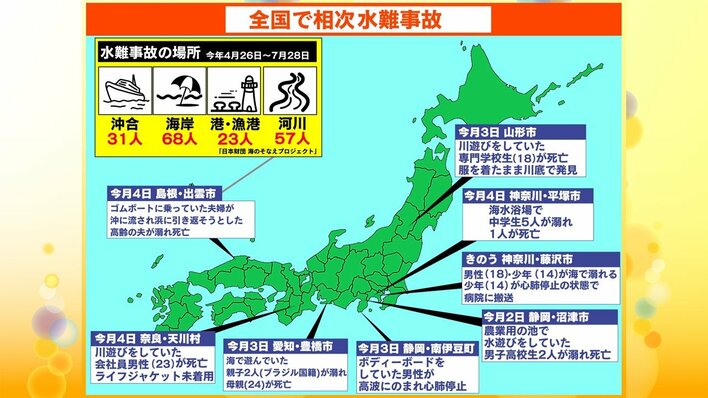 水難事故に関する調査を行っている、「海のそなえプロジェクト」によると、2025年4月26日〜7月28日の間で、全国の対象水域溺水者数は198人、うち131人が死亡、15人が行方不明となっています。