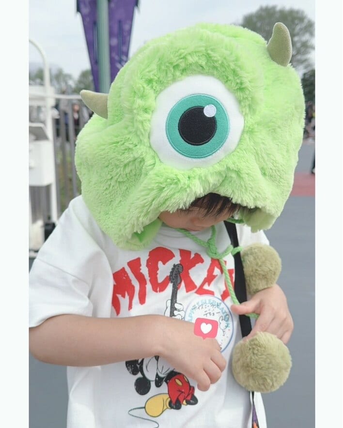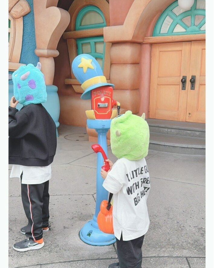 投稿された写真には、親子に人気の「トゥーンタウン」で、モコモコのファンキャップを被った長男と次男の姿が。