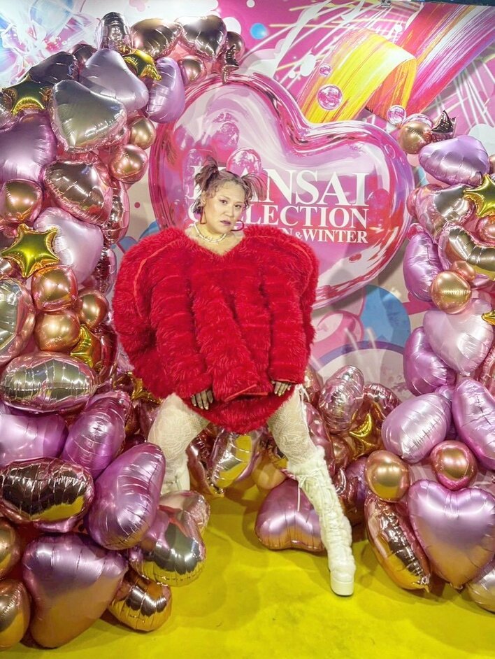 ピンクがかった髪の毛を2つに結んだ様子や周りに置かれたたくさんのピンクのハート型の風船も相まって、ド派手な印象を受けます。