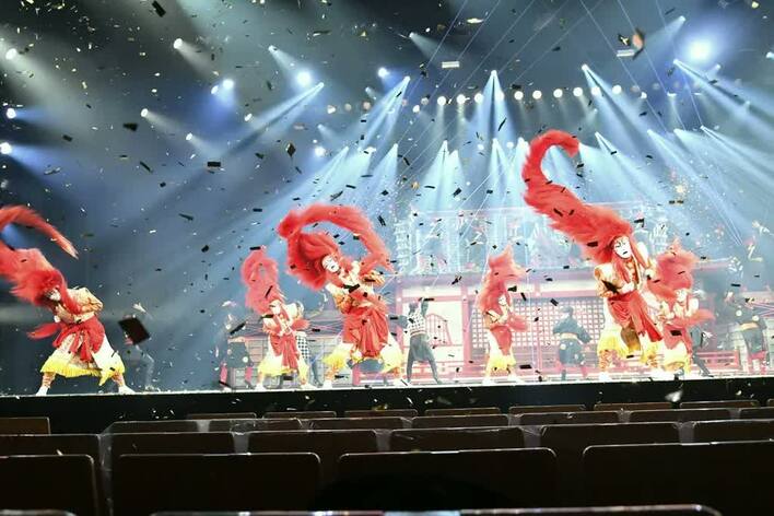 岩本さんの「春の踊りは」の掛け声の後、全員が「よぉいやさー」と声を上げスタートした第一部。300万枚の桜が落ちる華やかな演出の下、「ひらりと桜」を歌い踊りあげるほか、生化粧や腹筋太鼓をなど和をテーマとしたエンターテインメントを繰り広げました。