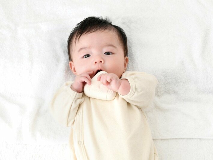 なんでもなめちゃう赤ちゃんのために、お口に入れても安心感のあるお米素材を原料に使用し、小さな手指でも持ちやすいよう形や重さにもこだわった、赤ちゃんの「なめる好奇心」を思う存分に満たしてくれるおもちゃです。