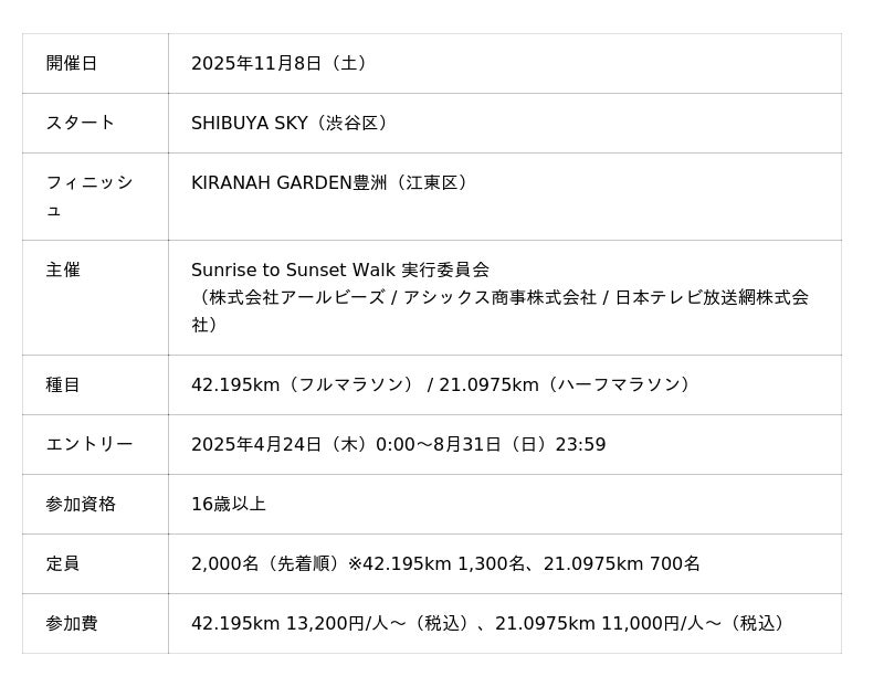 日本テレビ放送網株式会社(東京都港区、代表取締役社長執行役員:福田 博之)は、アシックス商事株式会社(兵庫県神戸市、代表取締役社長:小林 淳二)、株式会社アールビーズ(東京都渋谷区、代表取締役社長:黒崎 悠)と三社共同主催で東京都内を42.195km歩いて巡るウォーキングイベント「Sunrise to Sunset Walk」を2025年11月8日(土)に開催します。