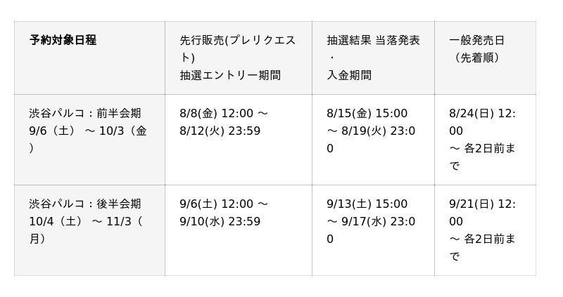 渋谷PARCO会場の会期初日 より2日間〈9/6(土)、9/7(日)〉は併設のグッズショップの混雑が予想されます。その為、上記期間は「グッズショップ入店整理券」をLivepocket(先着順)にて事前予約を受付いたします。