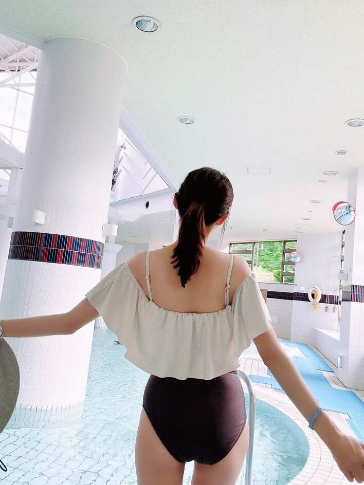 写真には、リゾート感漂う屋内プールを前に、カメラに背を向けた状態でたたずむ押切さんの姿が。フリルの付いた白いオフショルダーから見える美しい背中が目を引きます。引き締まったウエストラインやスラッとした美脚もうかがえ、押切さんの美ボディが際立つショットです。