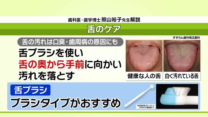 また口臭や歯周病の原因にもなる「舌の汚れ」は、舌の表面が白く汚れていると感じたときに舌ブラシを使ってケアするのが基本だそうで、三木さんは「歯が弱い家系なのだが、毎月歯科医に通うようになったら虫歯にならなくなった」と医師に相談しながらケアすることの大切さを語りました。