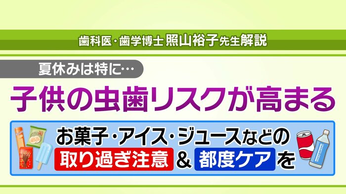 夏休みは子どもの虫歯リスクが高まる季節でもあるそうですが、照山先生によると気をつけたいのは「間食の頻度」。食事をすると口の中が酸性になるので、大人に比べて歯が柔らかい子どもにとっては、ものを食べる回数が増える分だけ虫歯になるリスクが高まるといいます。
