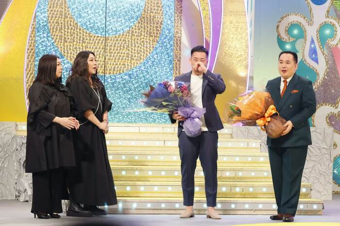 ミルクボーイの大賞受賞を祝い、海原やすよ ともこの2人が駆けつけ、花束を渡す場面では、両コンビとも感極まって涙を流す場面も。