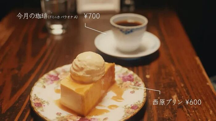 そして、デザートメニューを見た純平は、店内にいる女性客らが食べていた西原プリン(600円)を見つけると、今月の珈琲とともに注文しました。