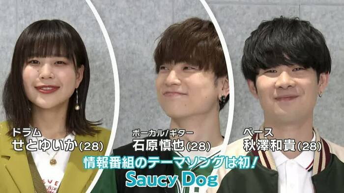 4月から『めざましどようび』の新テーマソングはSaucy Dogの「優しさに溢れた世界で」になりました。Saucy Dogは、ボーカル・ギターの石原慎也さん、ベースの秋澤和貴さん、そしてドラムのせとゆいかさんの3人組ロックバンド。特にラブソングがエモい!と若者を中心に大注目を集めているロックバンドです。