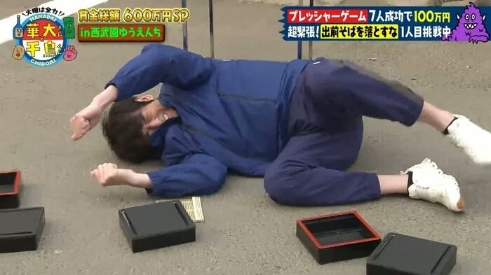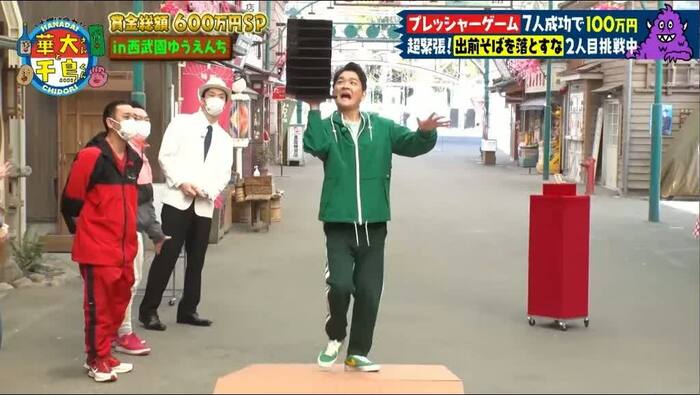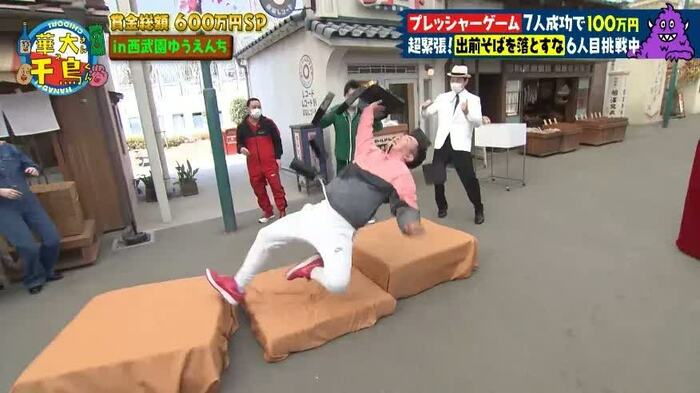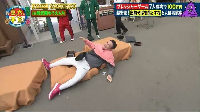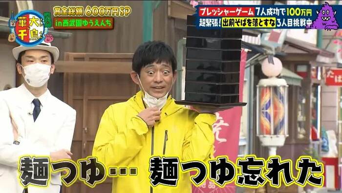 博多華丸さん、博多大吉さん、千鳥(大悟さん、ノブさん)、山内健司(かまいたち)さんを含めた7人が1人ずつゲームに挑戦し、全員成功すれば、賞金100万円を獲得できます。